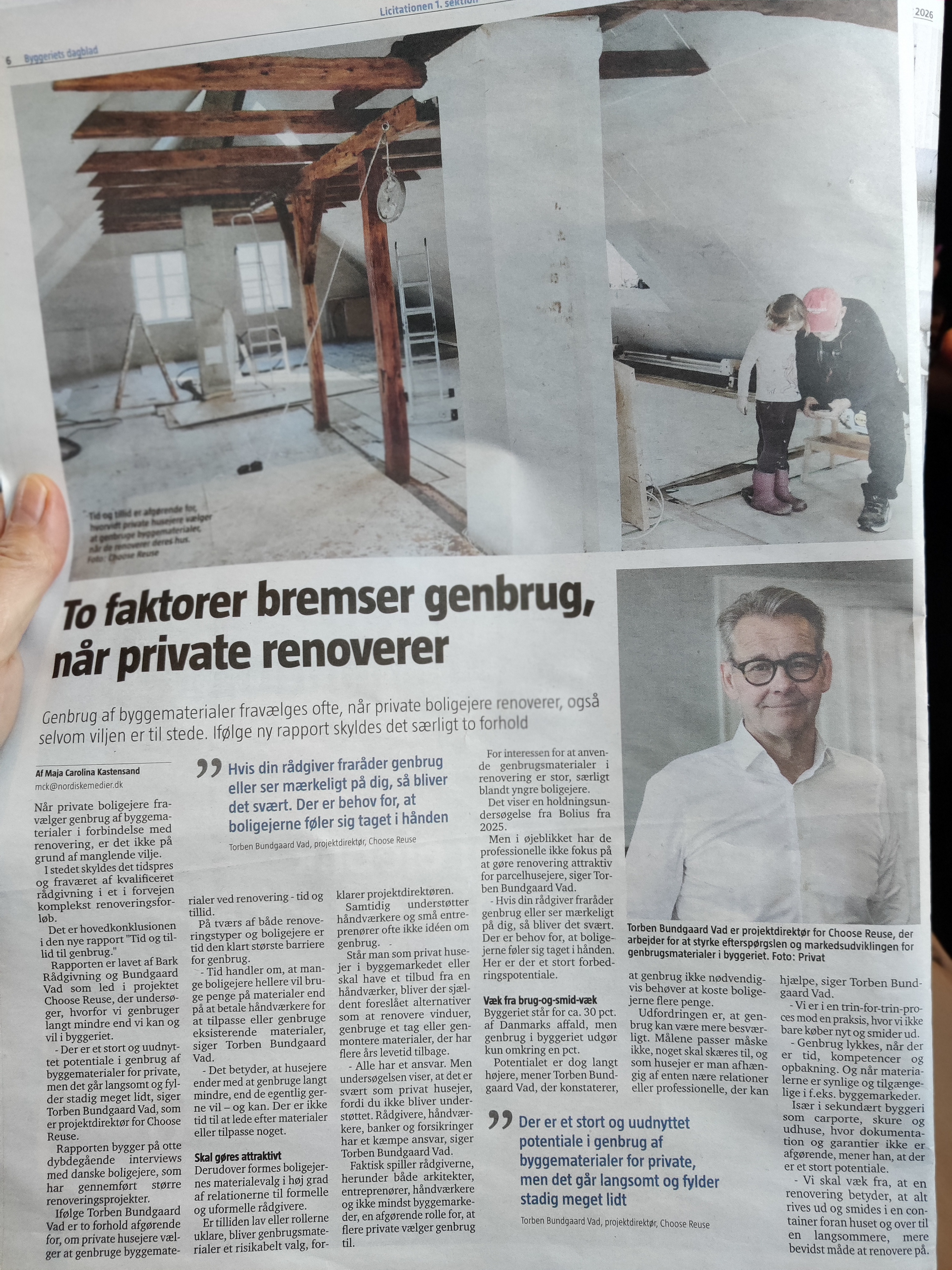 Danske boligejere vil gerne genbruge byggematerialer når de renoverer. Alligevel bliver genbrug ofte fravalgt, når renoveringsprojektet går i gang. En ny undersøgelse gennemført af BARK Rådgivning og Bundgaard Vad, i ChooseReuse projektet viser, at det ikke handler om manglende ambitioner – men om manglende tid og tillid. Rapporten "Tid og tillid til genbrug" bygger på otte dybdegående portrætter af danske boligejeres renoveringsprojekter. I analysen identificerer vi fire typer af boligejere: Idealisten, Pragmatikeren, Æstetikeren og Budgetstyreren. Fælles for dem er, at genbrug ofte fravælges, når processen opleves som for usikker og risikabel, for tidskrævende og der mangler tillid i relationen til de professionelle partnere i byggeriet.